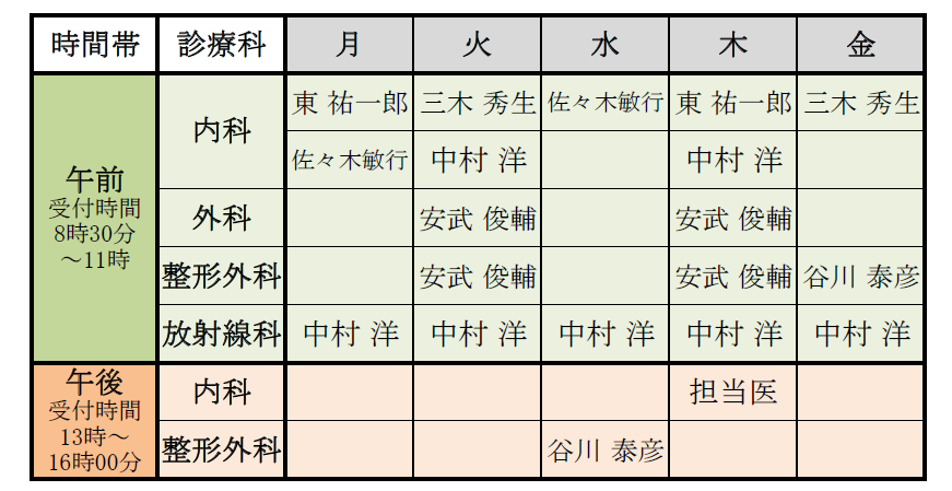 - ※木曜日午後の内科は当院の内科医師が診察します。医師に関する情報は医師紹介ページをご覧ください。