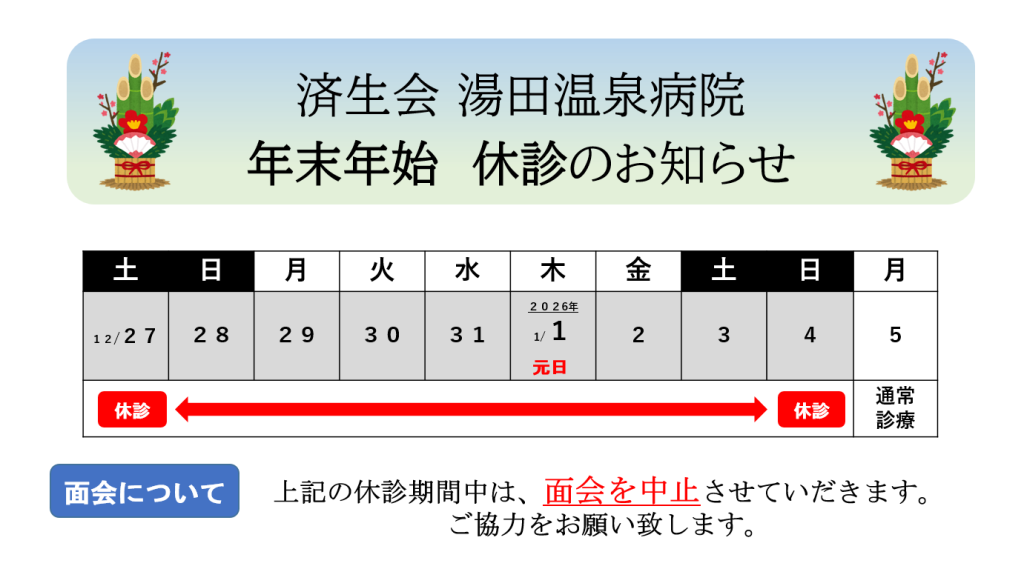 ホーム 新着情報一覧 湯田温泉病院における年末年始の休診及び面会中止について 湯田温泉病院における年末年始の休診及び面会中止について 当院は12月27日(土)~1月4日(日)の期間、一般外来を休診とさせていただきます。 1月5日(月)より通常診療を再開いたします。 また、休診期間中は面会を中止させていただきます。 ご理解とご協力の程よろしくお願い申し上げます。 済生会湯田温泉病院 院長 直前のページに戻る